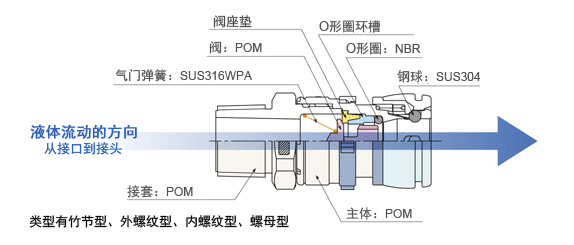 W系列是水路管道用的塑料接头。其主体使用POM树脂、气门弹簧使用的SUS316WPA,重量轻且防锈性能好。